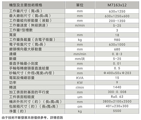 1、本機床屬于重切削磨床,適用于機械制造、模具等行業(yè)的平面磨削??赡ハ麂摷?、鑄件及有色金屬等材料。工件可直接固定在工作臺面上或放在電磁吸盤上磨削。